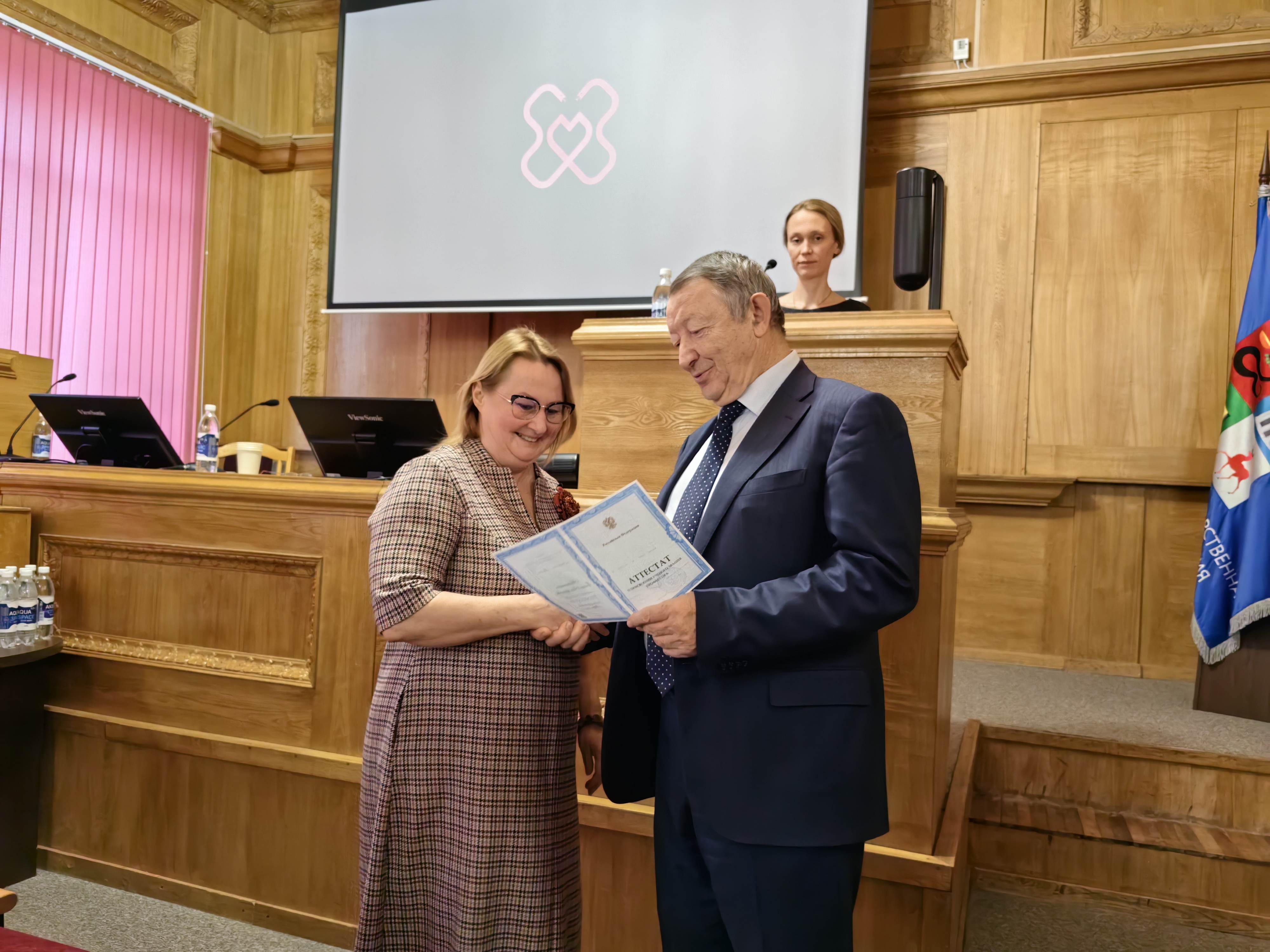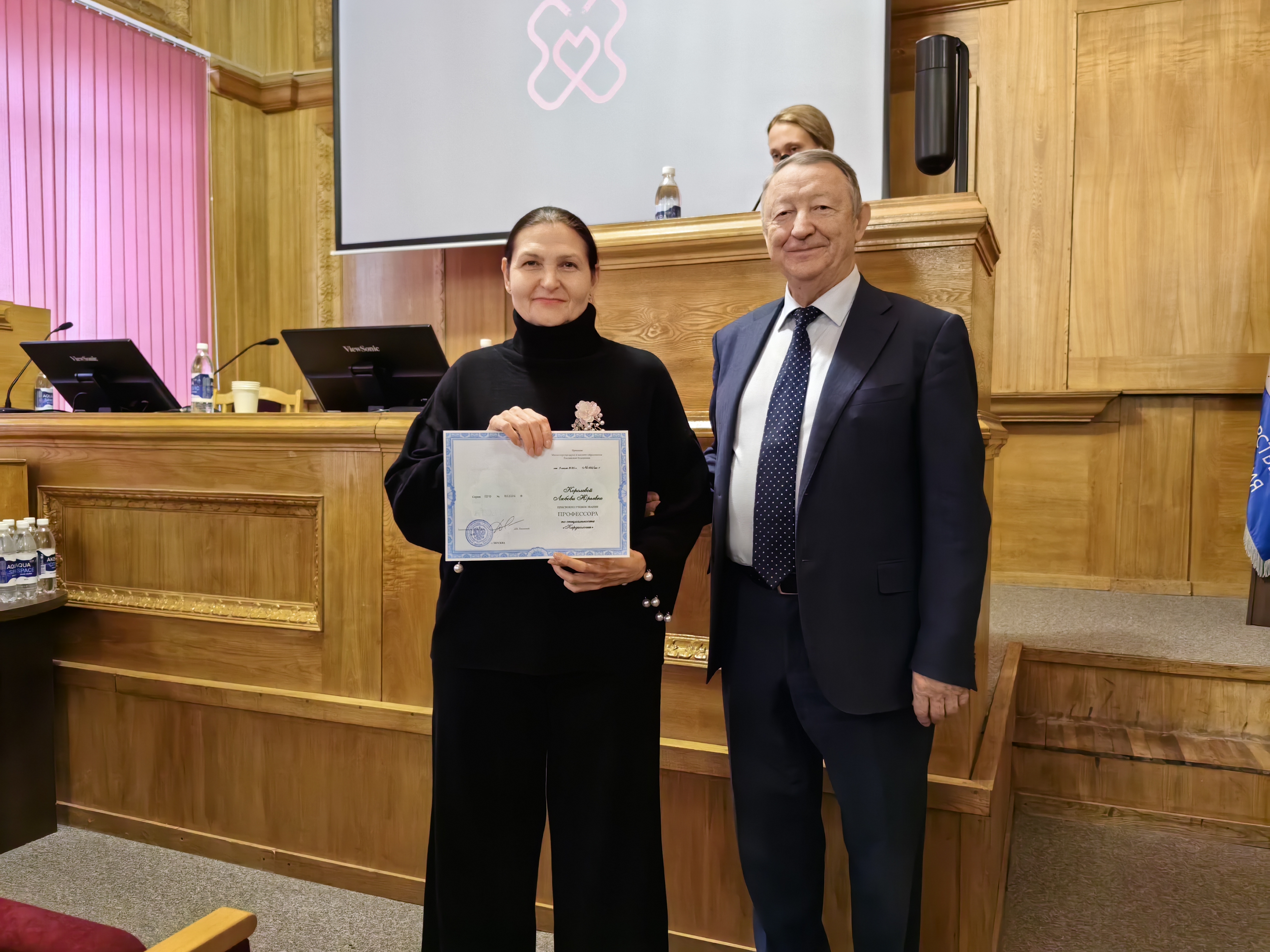 Заседание открылось важной церемонией. Аттестаты профессора были вручены Елене Альбертовне Антипенко (кафедра неврологии, психиатрии и наркологии ФДПО) и Любови Юрьевне Королевой (кафедра госпитальной терапии и общей врачебной практики им. В.Г. Вогралика). Коллеги тепло поздравили новых профессоров с заслуженным признанием.