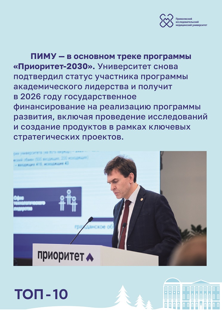 ПИМУ — в основном треке программы «Приоритет-2030». Университет снова подтвердил статус участника программы академического лидерства и получит в 2026 году государственное финансирование на реализацию программы развития, включая проведение исследований и создание продуктов в рамках ключевых стратегических проектов.
