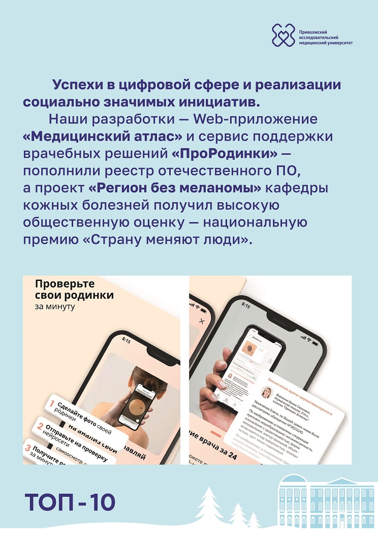 Успехи в цифровой сфере и реализации социально значимых инициатив. Наши разработки — Web-приложение «Медицинский атлас» и сервис поддержки врачебных решений «ПроРодинки» — пополнили реестр отечественного ПО, а проект «Регион без меланомы» кафедры кожных болезней получил высокую общественную оценку — национальную премию «Страну меняют люди» . - Масштабный форум к 105-летию.