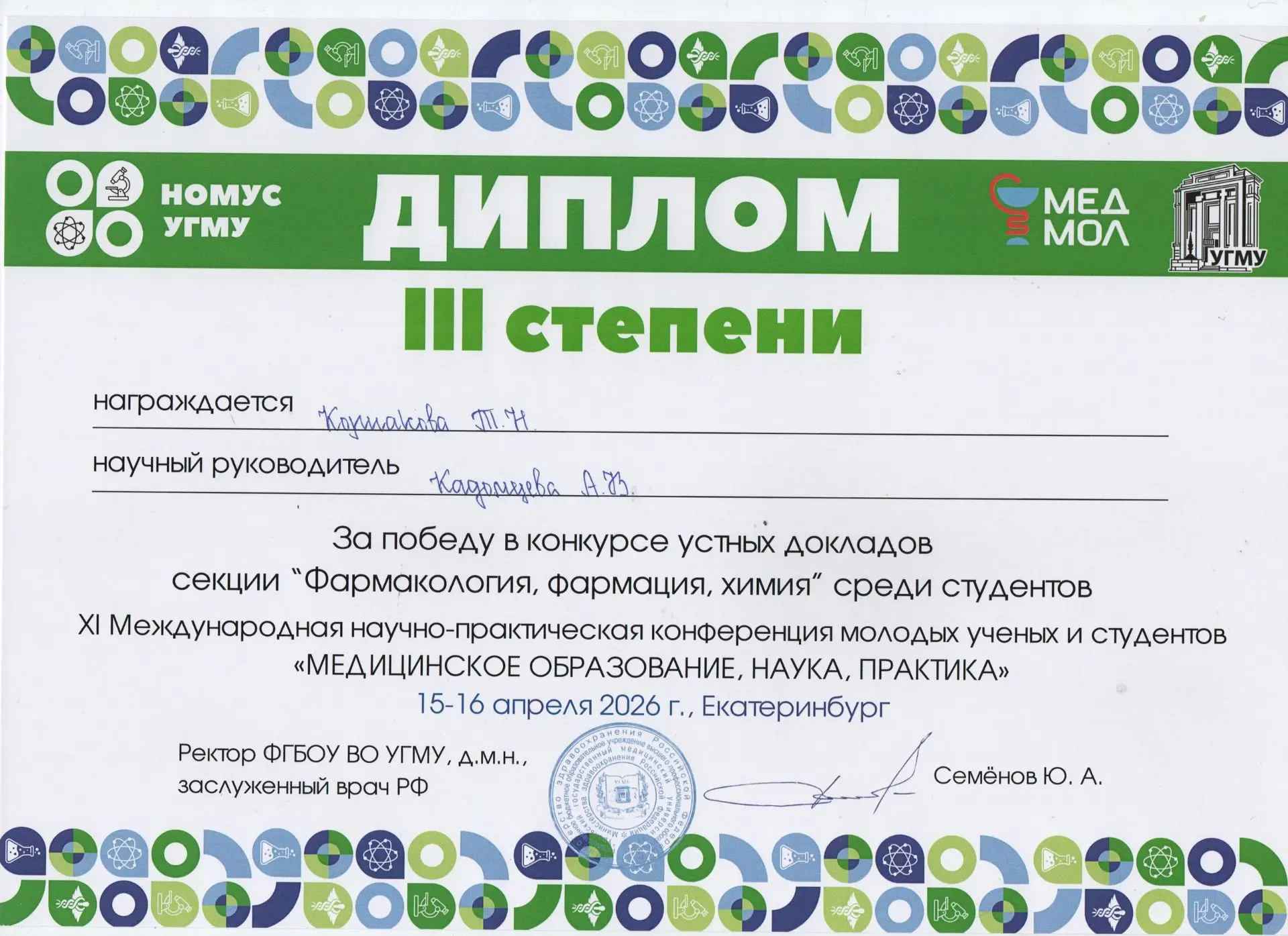 Подведены итоги XI Международной конференции молодых учёных и студентов «Медицинское образование, наука, практика», которая проходила в Екатеринбурге. В секции «Фармакология, фармация, химия» почётное 3 место заняла студентка 449 группы Приволжского исследовательского медицинского университета Корпакова Татьяна.
