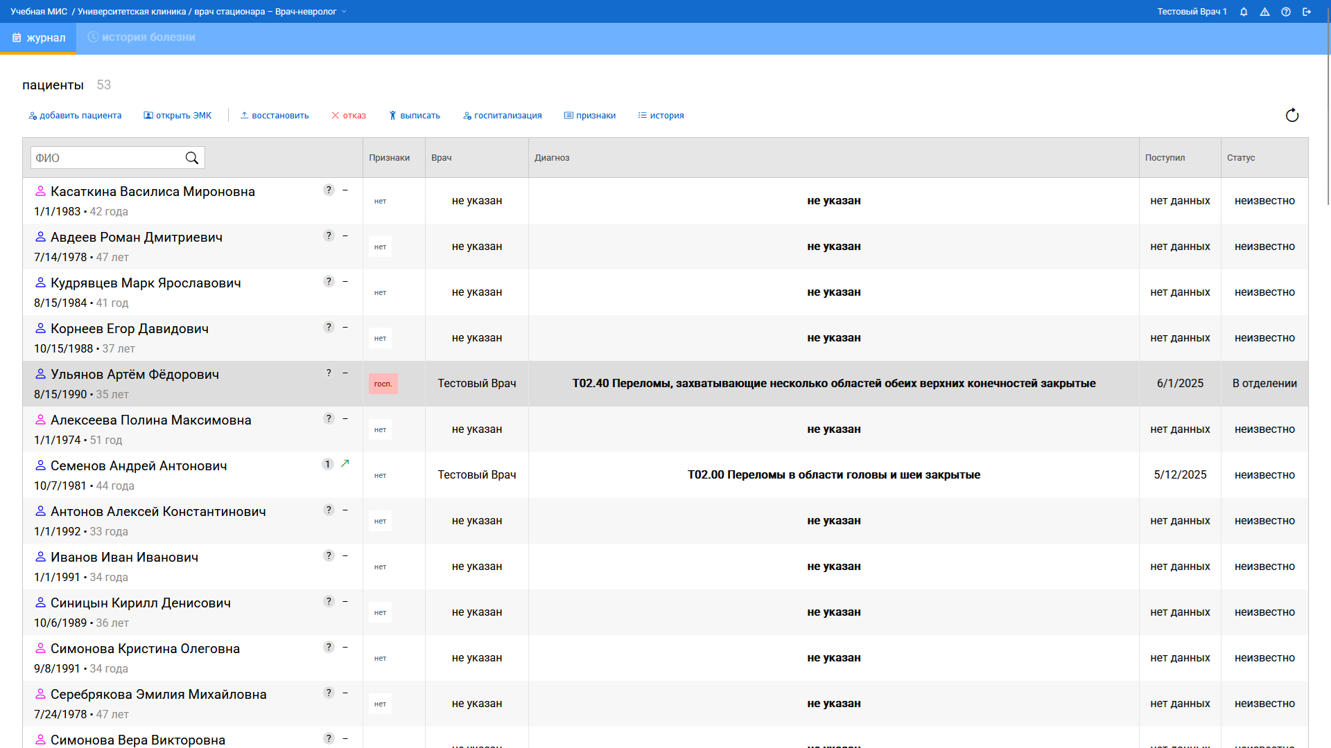 Система поддерживает смену ролей (врач поликлиники, регистратор, врач стационара, врачи лабораторной и инструментальной диагностики), что позволяет отрабатывать межпрофессиональное взаимодействие и последовательность клинических процессов.