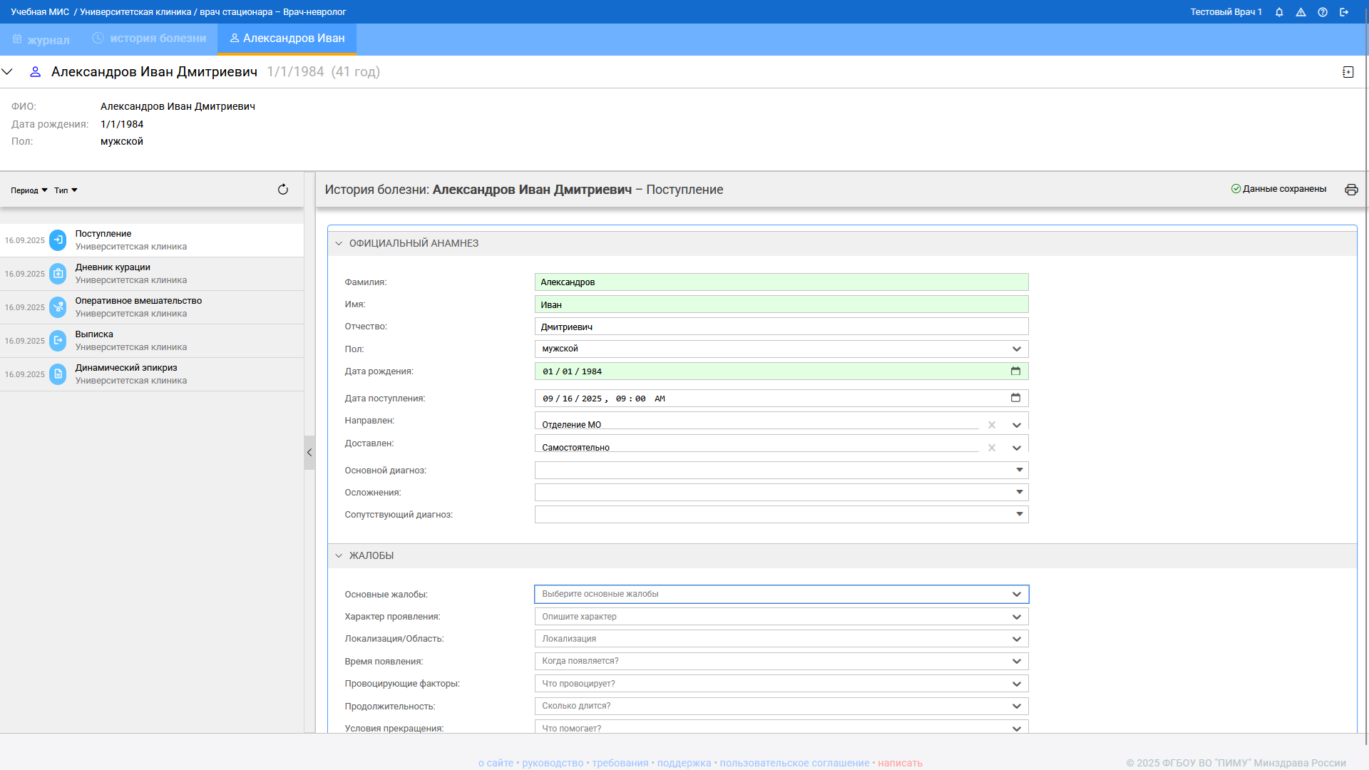 Полное ведение электронной карточки пациента и заполнение приёмных/госпитальных протоколов