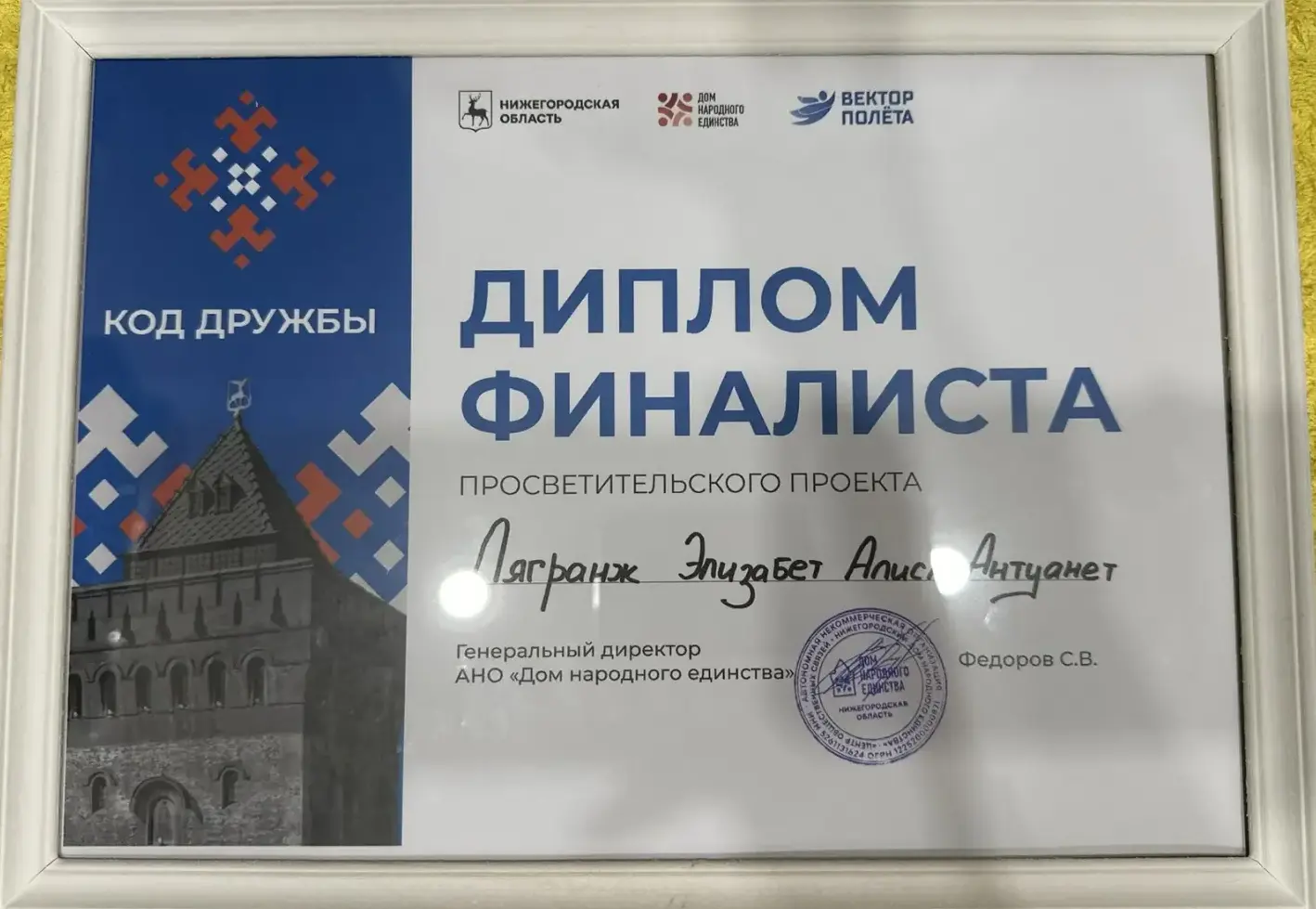 В Доме народного единства подвели итоги яркого и значимого просветительского проекта «Код дружбы», объединившего иностранных студентов нижегородских вузов.Финалистами проекта стали слушатели подготовительного отделения для иностранных граждан ПИМУ: Илич Йована (Сербия), Хаддур Морхав (Сирия) и Лягранж Элизабет (Франция).