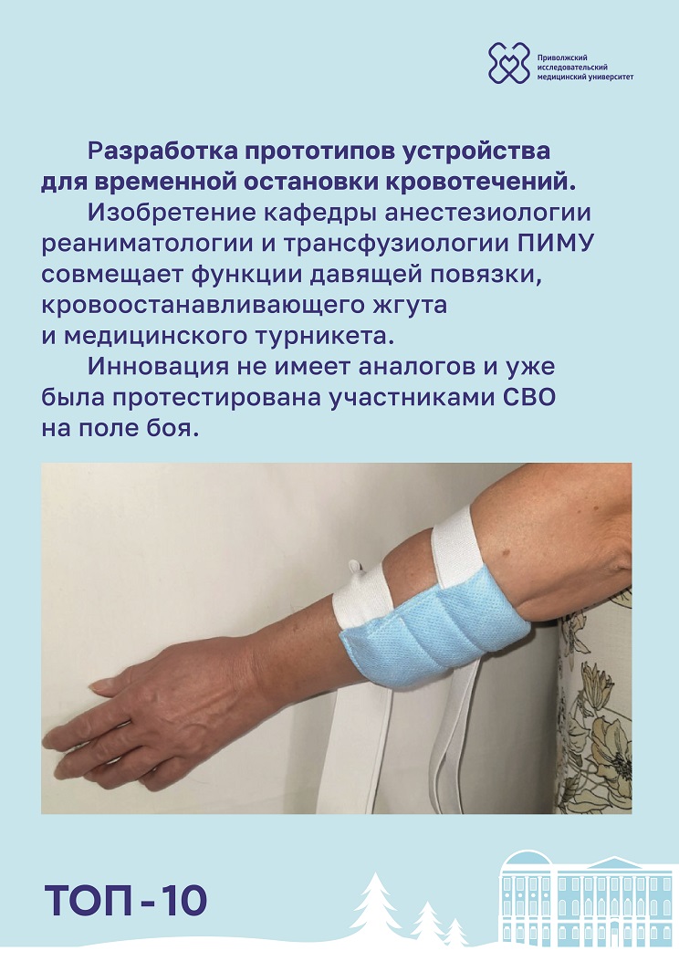 Разработка прототипов устройства для временной остановки кровотечений. Изобретение кафедры анестезиологии реаниматологии и трансфузиологии ПИМУ совмещает функции давящей повязки, кровоостанавливающего жгута и медицинского турникета. Инновация не имеет аналогов и уже была протестирована участниками СВО на поле боя. - Издание-лидер.