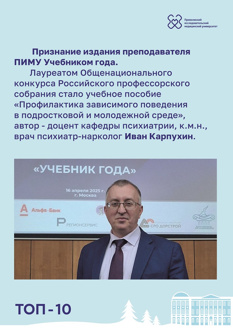 Признание издания преподавателя ПИМУ Учебником года. Лауреатом Общенационального конкурса Российского профессорского собрания стало учебное пособие «Профилактика зависимого поведения в подростковой и молодежной среде». Издание вышло под редакцией - доцента кафедры психиатрии, к.м.н., врача психиатра-нарколога Ивана Карпухина. - Передовые технологии в операционной.