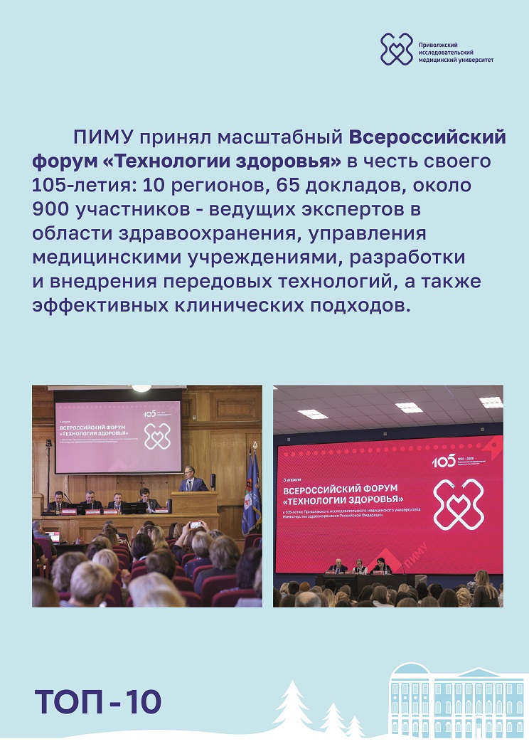 ПИМУ принял Всероссийский форум «Технологии здоровья» в честь своего 105-летия: 10 регионов, 65 докладов, около 900 участников - ведущих экспертов в области здравоохранения, управления медицинскими учреждениями, разработки и внедрения передовых технологий, а также эффективных клинических подходов. - Рекордный абитуриентский спрос.